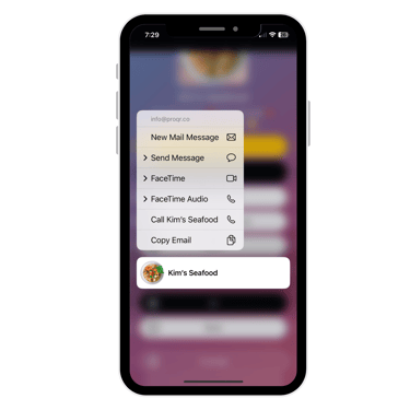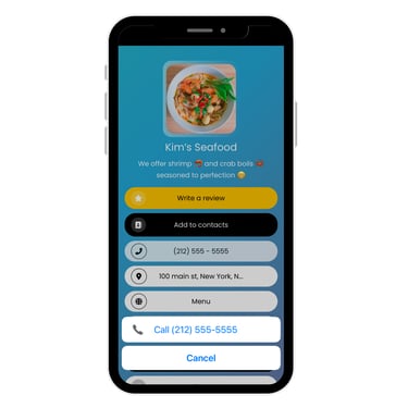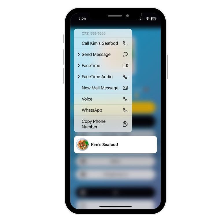 Users can call, text, or FaceTime directly from your profile, utilizing integrations with services such as WhatsApp and Google Voice. Additionally, they can copy your phone number, with your business name seamlessly integrated into the contact details for added convenience.