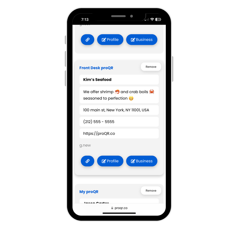 Instantly update your proQR profile with the latest business information, ensuring your customers always have access to the most current details.